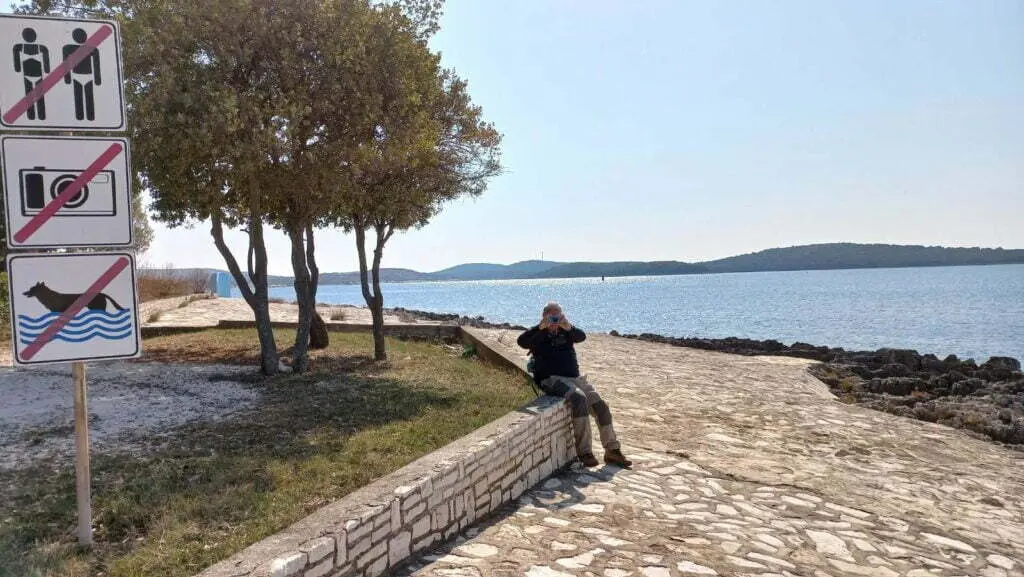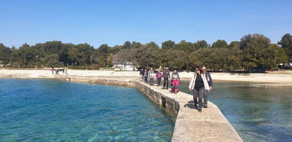 V nedeljo, 20. 3. 2022, smo dan začeli lagodno: kava in zajtrk v lastni režiji, kar je za mnoge pomenilo špancir do bližnje pekarne, potem pa odjava in zbiranje pri Mileni in Vojcu. Od tam smo ob 11. uri krenili proti Vrsarju. Iz marine smo se na polotoku Montraker povzpeli na razgledišče, s katerega se odpira pogled na številne otoke in otočke ob tem delu obale. Na drugo stran smo se spustili v stari kamnolom, kjer letno potekajo mednarodne kiparske delavnice. Nastale bele skulpture krasijo nabrežje in parke – prenekatere smo videli tudi mi. Iz kamnoloma smo preko kampa Orsera, kjer sta nas presenetila dva laboda, obiskali še Park skulptur Dušana Džamonje. Tiste, ki smo opazili, da so nekatere skulpture narejene iz dolgih žebljev, ne preseneča zafrkljiv vzdevek, ki se je umetnika prijel za časa življenja in ustvarjanja, Dule-ekser. V parku smo si vzeli čas za pohajkovanje po lepo urejenih tratah, potem pa smo se vrnili v Vrsar, kjer smo se povzpeli vse do starega dela s cerkvijo sv. Martina. Med spustom v marino smo obiskali kar nekaj razgledišč s krasnimi priložnostmi za lepe fotografije, tudi vidikovac Casanova, poimenovan po slovitemu zapeljivcu, ki je kar dvakrat obiskal to čudovito istrsko mestece. Ko smo vendarle spet dosegli nadmorsko višino 1 m, smo se sprehodili do restavracije, kjer nas je čakalo izbrano kosilo: kalamari, meso z žara ali pica. Čeravno smo ta dan prehodili polovično razdaljo prejšnjega dne, sta nam tako jedača kot pijača neizmerno teknila.