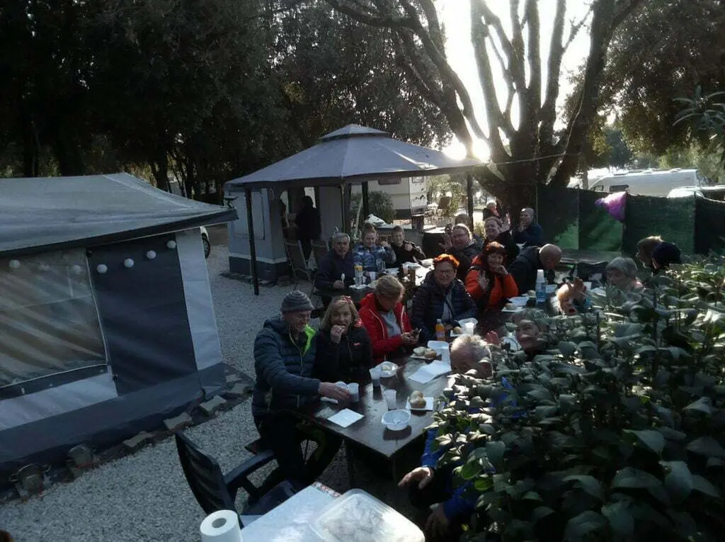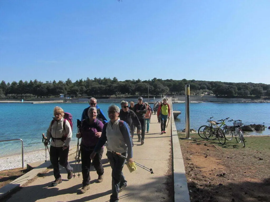 V soboto, 19. 3. 2022, smo se že pred 9. uro zjutraj začeli zbirati pri recepciji kampa Porto Sole v Vrsarju. Kljub sončnemu imenu in vremenu, je bilo jutro kar hladno. Malo smo se (p)ogreli s sprehodom čez kamp, malo s pijačo dobrodošlice pri gostiteljema Mileni in Vojcu, malo pa s kavo na sončni plaži. Ob 10.15 smo se odpravili in pot nas je vodila ob plaži v kamp Koversada. Glede na to, da gre za naturistični oz. FKK kamp, smo bili veseli, da še ni obratoval. Ali pač? Spustili nismo niti istoimenskega otočka, ki je s celino povezan z mostom, in ga v celoti obhodili. Pot ob obali nas je razveseljevala s pogledi na čisto morje in prazne travnate parcele s cvetočimi marjeticami ter drugim cvetjem. Ob vhodu v Limski kanal se je nekaj planink poslovilo, ostali pa smo se podali na stezo skozi bujno rastje in čez posamezne skale, zaradi katerih so bili zadovoljni sami s sabo tisti, ki so obuli gojzarje. Ta pot Sv. Romualda nas je mestoma pripeljala čisto do vode – v nekem zalivčku smo razburili gosaka, – drugod pa smo na morje gledali precej zviška. Mimo razgledišča oz. po hrvaško vidikovca, kar nam gre večini verjetno še vedno bolj v uho in lažje z jezika, s postankom za fotografiranje nad Limskim kanalom, smo prispeli do piratske jame. V jamo je domiselno umeščen bar, ki je bil na žalost zaprt. Vseeno smo uporabili vzidane mize in klopi ter se okrepčali s pijačo in jedačo iz nahrbtnikov. Ravno na ta spust do jame, kjer smo se približali nadmorski višini 0 m, in kasnejši vzpon skozi gozd Kontija do vidikovca Mukaba na približno 125 m nadmorske višine, se lahko izgovarjamo, če bi nam kdo očital, da smo se samo sprehajali ob morju. Z razglednega stolpa na Mukabi se odpira pogled na Limski kanal in Rovinj na jugu, Vrsar na zahodu, pa vse do Učke na severovzhodu. Od tam smo se mimo oljčnih nasadov, njiv in pašnikov ter izstopajočih cvetočih srebrnih akacij oz. mimoz po bližnjici vrnili v kamp. Verjetno lahko trdim za vse, da nas je bližnjica razveselila, saj po 5 urah hoje (ca. 18 km) po toplem spomladanskem soncu in nazadnje po izpostavljenih prašnih makadamskih poteh, nihče ni pogrešal ovinka še čez en hribček v Vrsar. Posebej mi je bilo celo naročeno, da naj zapišem, da je bila ta, skrajšana varianta 6 km daljša od obljubljene. V kampu smo se nastanili v krasne mobilne hiške, se tako ali drugače osvežili in se spet zbrali pri Mileni in Vojcu, kjer nas je čakala hladna pijača in odličen pasulj. Po obedu in druženju smo se hitro raztepli vsak na svojo stran, saj smo energijo za ponočevanje pustili nekje ob Limskem kanalu.